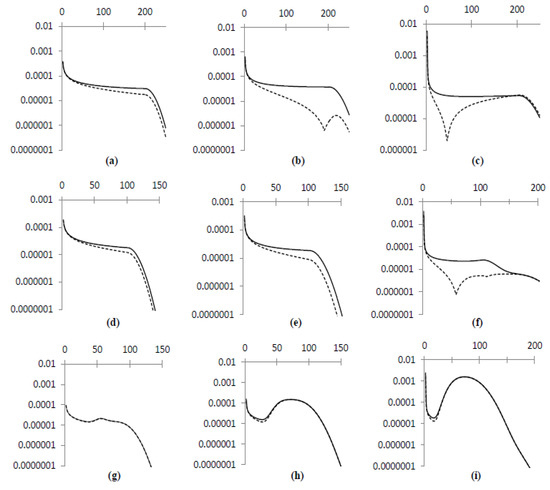 The approximation errors (solid lines) and (dashed lines) as functions of : (a) ; (b) ; (c) ; (d) ; (e) ; (f) ; (g) ; (h) ; (i) .