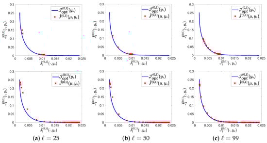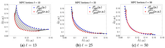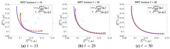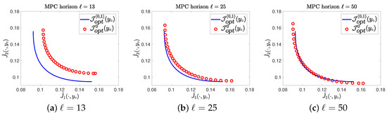 The obtained results when using strategy 1 for computing are shown in the top row of Figure 1a–c. It is clearly visible that an increasing MPC horizon length has the positive effect that the MOMPC points produced by Algorithm 3 are located closer to the Pareto front . This can be explained by the fact that a larger MPC horizon allows for a better prediction of the future behavior of the system dynamics. However, we see a clustering of MOMPC points in the middle of the Pareto front, which only slightly improves, if the MPC horizon length is increased. So it is not possible to obtain the whole extent of the Pareto front by varying the initial control .