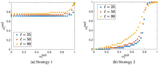 For strategy 2 the clustering in the lower part of the Pareto front for MPC horizon lengths of and can be deduced, since up to an initial weight of , the value of stays below a value of 0.1, which means that the resulting MOMPC point is in a region of the Pareto front, where the cost function is weighted much more in comparison to the first cost function . Moreover, for these two MPC horizons, we can see a clear cut-off behavior at a value of 0.8. If is larger than 0.8, the value of is larger than 0.9. For an MPC horizon length of , we do not observe such a clear cut-off behavior. Although the plot is still far from being the identity, it is visible that one can control the outcome of the MOMPC algorithm more precisely by varying the initial control.