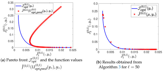 The most important question is how to perform step 5 of Algorithm 1. Clearly, one possibility is to compute the entire Pareto set , which is nonempty by Theorem 1, and then to choose a control according to some given preferences. However, this procedure is computationally costly, and thus, infeasible for many applications. On the other hand, one could compute only one Pareto optimal control . Then the question is under which criteria this control should be computed. In Reference [10], the authors allowed an arbitrary choice for and used the additional constraint