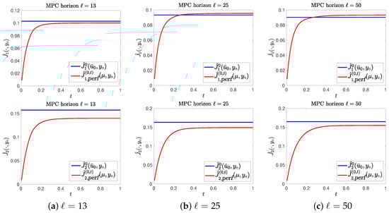 On the other hand, we can see the results of strategy 2 in the bottom row of Figure 1a–c. Let us first note that the inequality (15) is fulfilled in most steps of Algorithm 3 for all initial controls . Only for some initial controls , for which is located on the top left part of the Pareto front , that is, for initial controls corresponding to the part of the Pareto front, where the main goal is to minimize almost regardless of the function values of , the condition (15) is not fulfilled in some steps of the MOMPC algorithm. The reason for this is the following: When using Algorithm 2 for computing a feedback , the resulting minimizer of (13) displays the weight of the cost functions at the Pareto optimal point . If we start with a point , for which is located on the top left part of the Pareto front , the weighting of the cost functions will be . Therefore, the descent direction from Algorithm 2 will mostly point in the direction of the negative gradient of the first cost function, which might lead to (15) not being satisfied.