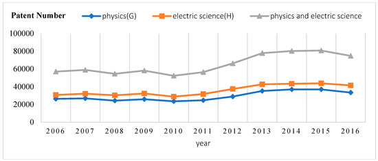 The total number or respective numbers of physics (G) and electrical science (H) patents according to international patent classification indices.