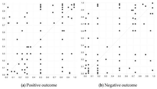 Unlike regression-based models, fsQCA does not assume that dependent and independent variables are symmetric. If the presence of an element is sufficient for the desired outcome to occur, the absence of that element does not necessarily imply automatically the absence of the outcome. Figure 2 illustrates data from the sample plot on the models produced for the positive (a) and the negative outcome (b) and shows that the relationships between the causal combinations in the models and the levels of anxiety are asymmetric. For example, we can see in Figure 2a that high values in any of the causal combinations of the solutions 1, 2, 3, or 4 (model for positive outcome) are sufficient for low levels of anxiety (high values of the outcome) to occur, but high values of these same solutions are not necessary for low levels of anxiety to occur [92].