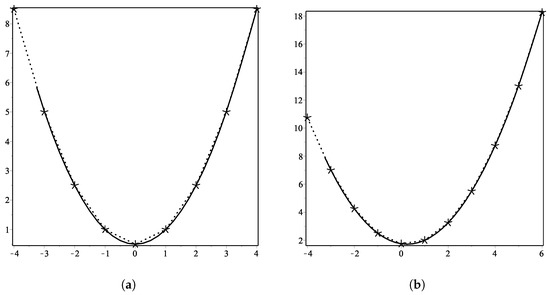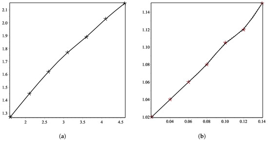 In this example we consider convex data from a convex function which is given in Table 5, that fulfill the derived condition of convexity, i.e., it is easy to get that . We apply -scheme on this convex data five times. Graphical representation of this application is given in the Figure 3a. In this figure dotted line shows the initial positive data and the solid line represents the limit curve generated by -scheme. From the Figure 3a, it is clear that the -scheme is capable of producing convex limit curves.