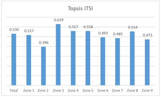 The TOPSIS indicator is used to obtain the institutional trust synthetic indicator (ITSI) for every segment included in the dataset. Figure 1 shows the results for the Ecuadorians and the nine regional segments (zones). It can be seen that the citizens who manifest less trust towards the six institutions included in the analysis are those who reside in Napo, Orellana, and Pichincha—zone two. This fact can be explained, in part, because Napo and Orellana are Amazon provinces that have experienced a lack of opportune public intervention, and also because some of the natural resources of the region (minerals and oil) have been extracted with a very strong opposition from the autochthonous communities. The metropolitan District of Quito, the capital city of Ecuador, belongs to zone nine and shows the second minimum trust level. The capital city is usually an active node of all the important historical facts that have occurred in the democratic, social, and economic life of the country []. The habitants of El Oro, Loja, Zamora—zone seven, and those from Cañar, Azuay, Morona Santiago—zone six, show intermediate trust levels and are characterised by being in areas located in the Amazon and Andean regions with the exception of El Oro that belongs to the Coastal region. These areas are geographically separated from the capital city, and this might explain the lack of public intervention in the regions that also favours low political participation of the citizens. In some provinces, the last elections showed that there was no relationship between the governments and the citizens, and this fact was used by the former president Correa to support the decentralisation of the state as a strategy to facilitate and foster the political participation of the citizens [].