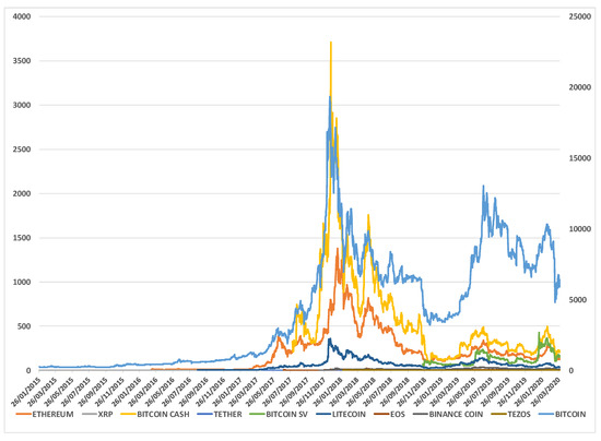 The importance of the cryptocurrency market has continued to increase, even in recent years. References [1,2] highlighted that the cryptocurrency market was worth more than $12.5 billion in 2016. Additionally, reference [2] noticed the growing popularity of the cryptocurrency markets, now being suggested in the literature as an investment asset, and highlighting that the price of the most liquid cryptocurrency—Bitcoin price—increased about 700%, from $616 to $4800 US dollars between October 2016 and October 2017. Presently, the overall cryptocurrency market is even more important as the total cryptocurrency market capitalization is $251.5 billion on 7 March 2020 and the Bitcoin price has increased almost 3300% from $269.2 to $8887.8 US dollars between the beginning (26 January 2015) and the final (7 March 2020) date of the sample period.