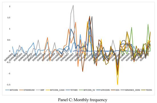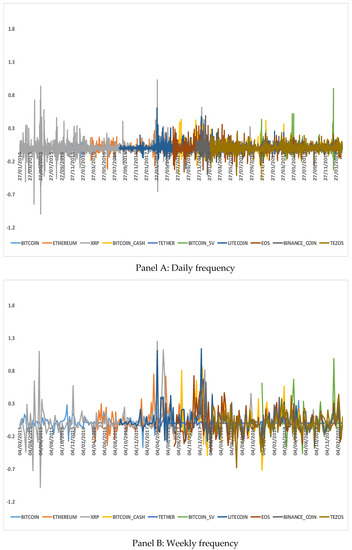 Figure 2 shows the time evolution of the cryptocurrency returns and Table 2 collects the descriptive statistics and unit root tests of the ten cryptocurrency returns for daily, weekly, and monthly frequency data. All cryptocurrencies show similar mean log returns, although Bitcoin_sv and Binance_coin show slightly higher mean values. Additionally, the lower the frequency of data, the higher the mean log returns and the higher the standard deviation. Most of cryptocurrency returns show positive skewness, except for Tezos which shows the largest negative skewness for all three data frequencies. All variables show excess kurtosis, especially for daily returns. The standard Augmented Dickey–Fuller (ADF) and Phillips–Perron (PP) unit root tests and the Kwiatkowski–Phillips–Schmidt–Shin (KPSS) stationarity test confirms that all cryptocurrency returns are stationary. However, for monthly data, it is interesting to note the smaller sample size for some cryptocurrencies that leads to some doubt about the stationarity of Theter and Tezos returns.