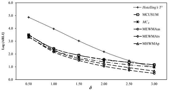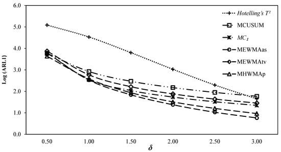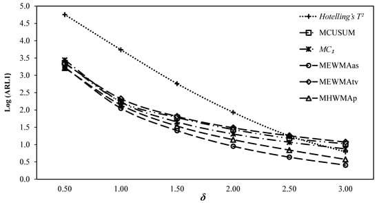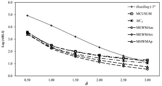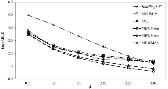 Average run length (ARL) comparisons for. MEWMA, multivariate exponential weighted moving average; MHWMA, multivariate homogeneously weighted moving average; MCUSUM, multivariate CUSUM.