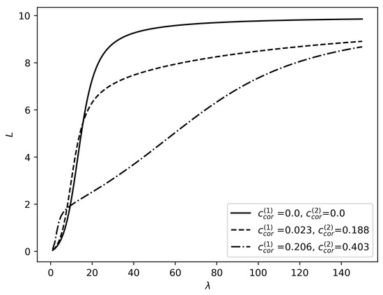 As expected, the values of and L increase when the input rate increases. More interesting is to analyze relative location of the curves for different coefficients of correlation. In the region a curve for the higher correlation is located above a curve for the lower correlation. It is worth recalling that in the considered example the service rate is , therefore, the region is associated with the region The relative location of the curves is changed when ( In this region, under the same value of the mean and L are significantly less for the than for the and . Also note a relatively low rate of increase in the case of the . Thus, with a large correlation, we observe poor average buffer occupancy (due to the high loss probability).