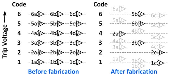 Redundancy was proposed to achieve a better tradeoff between power consumption and device mismatch and demonstrated for flash ADCs in [4,19,20,21] with extra comparators to be able to select the best offset voltages of 2N comparators for an N-bit design. Instead of putting one comparator for one comparison level, adding extra comparators to each level is implemented in the N-bit flash ADC, as shown in Figure 2. The calibration incorporating redundancy is to select and reassign the best comparators with the minimum offset for an N-bit design. If the standard deviation of comparator offset is at the order of 1 LSB, the probability distribution functions (PDFs) of the comparator offset will overlap with neighboring comparators. The comparator can be reassigned with the overlapping PDFs, which means a comparator nominally designed for one reference level can be used as another comparison level. For example, in Figure 2 comparator 2a can be used to represent Level 4 after fabrication. By utilizing the large number of redundancy comparators, this approach highly increases the probability that at least one comparator can satisfy the matching specification with a small area. However, the redundant comparators still occupy a large area although the unused comparators can be disabled and do not contribute power consumption.