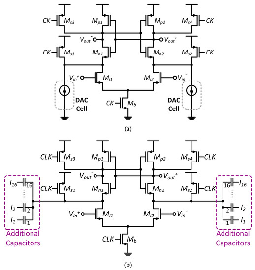 The other method to achieve better tradeoff between power consumption and device matching for an input differential pair in comparators, the digital calibration digital-to-analog converters (DACs) is also very popular in advanced CMOS processes. DAC-based calibration can be implemented by adding a current DAC tapping to the drain nodes of the input differential pair as shown in Figure 3a [22]. The overhead of the current DAC can be very low and it injects current to change the offset voltage to achieve better matching. The internal nodes can be also adjusted with digitally controlled capacitive DACs [23], as shown in Figure 3b. The capacitor mismatch is added to the signal path to create a slight imbalance that results in an offset voltage. Therefore, the random offsets can be cancelled with the capacitive DAC. Meanwhile, the capacitive DACs can further create a systematic offset to eliminate the requirement of the reference ladder. However, the dynamic mismatch errors that occur during high speed operation cannot be characterized with this methodology.