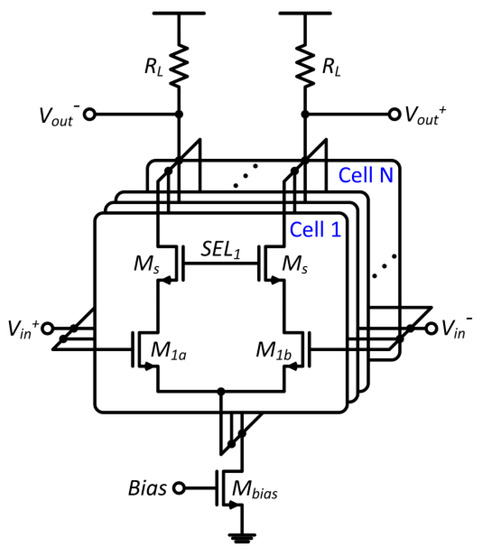 The basic concept of combinatorial randomness is to select a combination of identically designed elements for a critical circuit block, so it chooses one subset from the available subsets to meet the required specification. For example, a subset branch of input transistor pairs in an amplifier is selected to have a small input offset voltage, as shown in Figure 4 [5]. The differential amplifier with combinatorial randomness is composed of N pairs of input N-type metal-oxide-semiconductor (NMOS) transistors labeled as through and selection NMOS transistors with gates tied to digital control signals through . Each input pair can be selected by turning on or off with . Due to the random variations, each transistor would show different characteristics and, hence, the mismatches between the different input pairs leads to input offset voltages.