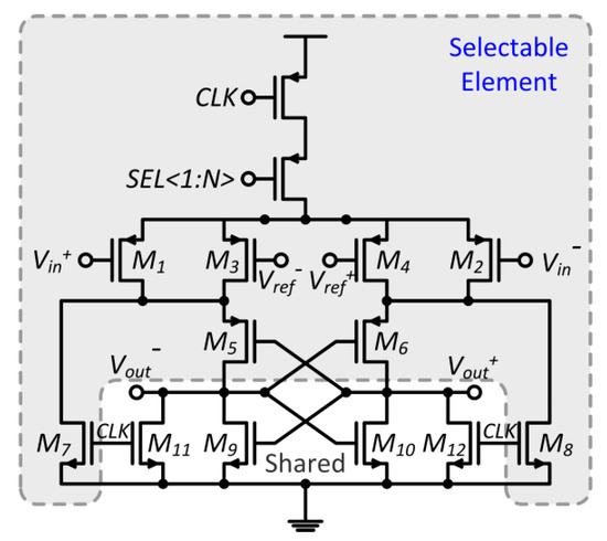 The aforementioned up-sizing approach based on the Pelgrom model and the redundancy methodology can be viewed as two extreme cases of the element selections. To realize the Pelgrom approach, all pairs from 1 to N are selected. Therefore, a lower effective variation can be achieved by utilizing the larger area by the selection of all branches, and the matching standard deviation can be improved by . To implement the redundancy approach, input pairs are grouped into predetermined identical blocks, and only one block is selected for each comparison level during post-manufacturing configuration. For example, the pair in Figure 4 with the best offset result is selected if one pair is predetermined to form one block and total number of selectable blocks is N. If pairs are predetermined to form one block, only two combinations cab be selected after manufacturing.