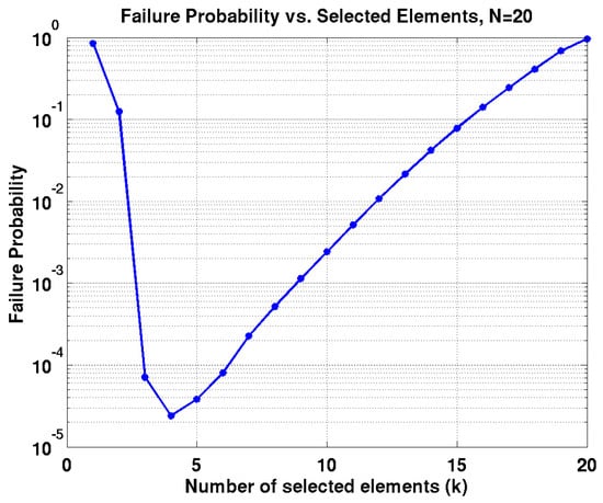 Combinatorial randomness selects k elements among N selectable ones at a time (). To show the efficiency of the presented methodology, the failure probability () for different values of k is simulated with , and offset specification (spec) is by using Monte Carlo samples in MATLAB in Figure 6 [5]. The failure probability, , that an absolute offset voltage of each element is larger than 1/100 of the standard deviation can be calculated from (4) using and .
