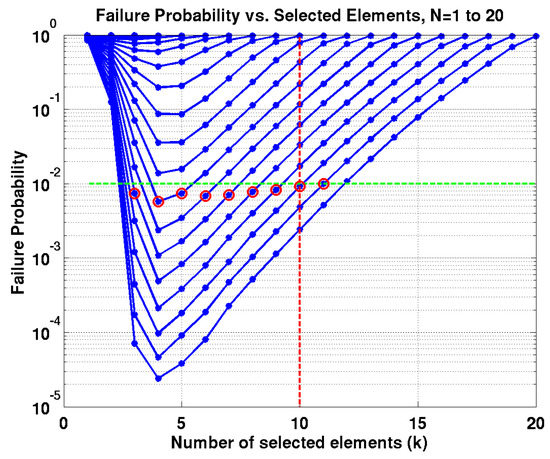 The up-sizing method can correspond to the rightmost point in the contour where all the 20 elements are select and only one subset is available (select all elements, ). The failure probability for this subset with the up-sizing method can be calculated from (4) with and because the standard deviation decreases by according to the result in [3]. The failure probability of the up-sizing method is simply because there is only one subset of 20 elements. The leftmost corresponds to the case with redundant elements and 20 independent subsets of only one element each () are available for selection. The failure probability of the redundancy approach can be calculated by . The failure probability of the combinatorial randomness is much lower than both redundancy and up-sizing approaches by several orders of magnitude if k is chosen between these two extremes, i.e., . While both N and k are varied, the failure probability of the combinatorial randomness is shown in Figure 7 [5], where each blue contour corresponds to a different N value (). The x-axis shows the number of the selected elements (k) among N selectable ones (). Each selectable element is assumed to follow and . The appropriate pair of N and k can be searched for a specific while the highest ratio for each k can be reached to reduce the parasitic loading, as shown in Figure 7 with red circles for each k.