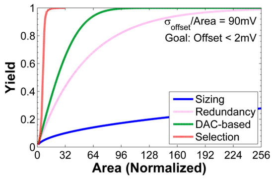 The comparison of abovementioned methods is shown in Figure 8 as normalized area is varied [5]. With Monte Carlo simulation with 10,000 samples in MATLAB, the yield for different methods can be estimated assuming that the offset voltage of each selectable element follows a normal distribution with . The yield for DAC-based calibration is: