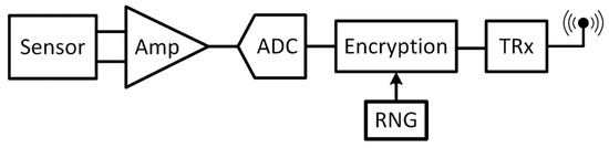 A sensor system with RFID is usually composed of a sensor front end, a transceiver, and a random number generator for data encryption, as shown in Figure 9. A strong encryption algorithm can prevent from an external attack. However, due to limited resources, such as power consumption, in wireless sensor networks for RFID wearable and implantable systems [36,37], pseudo-random number generators (PRNGs) were typically adopted instead of TRNGs for the simpler architecture. PRNG algorithms generate repeating random-like sequences with using an initial seed. Leaks of the random seed can make the PRNG outputs predictable [38]. Moreover, the PRNG output would be predictable if the internal state and the periodicity of the structure are known. On the contrary, TRNGs generate the random numbers from an observable activity or a physical process with true randomness. The conventional approach is power consuming because it requires a high-gain and wide-bandwidth amplifier to magnify the small noise voltages [39]. Utilizing energy harvested from an ambient environment to avoid frequent battery replacement provides a compelling solution for many distributed devices. However, the harvested power is limited and not stable while environmental conditions and energy sources vary. For example, energy harvested from thermoelectric generators (TEGs) is highly temperature dependent [40,41]. Therefore, the system for IoT applications to be powered by energy harvesters requires to consume very low power and operate at an ultra-low voltage of less than 0.5 V [41,42,43]. In addition, ubiquitous computing opens a new door for hackers to enter the central network through unprotected pervasive devices. Hence, the critical need is to integrate security measures into each connected device with minimum increase of power consumption. However, a gap exists to implement power-hungry advanced encryption standard (AES) in sensors. Moreover, to protect the key from being stolen through side-channel detection, advanced digital encryption may require additional circuits to shield fluctuations in the power source. On the other hand, the discrete-time chaos-based true random number generators (TRNGs) are not affected by statistics of the entropy source and resilient to the presence of the deterministic noise [44], which would be the promising security module that can be integrated onto resource-limited devices to provide complete security measures.