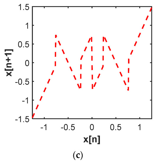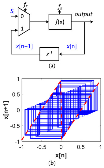 Whitening the primary features is how creatures efficiently communicate and hide themselves from predators, which appears to be a ubiquitous property of nature. Such effective ways to encrypt the signal, also known as the phenomenon of Chaos, can as essentially be thought of as “deterministic noise”. Dynamics of discrete-time chaotic systems can be governed by nonlinear maps. Figure 10a shows the self-feedback discrete-time chaotic system with a piecewise linear map shown in Figure 10b. The output of the chaotic generator, , is connected to the input of the map function, , as next input . The transformation function, , is given as , where is equal to 1 when ; is equal to −1 when . “” is the maximum output voltage so that the output is bounded by and . Si is the signal to encrypt and it is sampled at fc, while is clocked at fs. When fs is several times higher than fc, the sampled signal will be scrambled and permutated in the loop. The dynamic signal evolves from the underlying principle of self-similarity at different scales, as shown in Figure 10b, where the orbit is generated from an initial condition of 0.7 with a gain close to 2 and as 0.5. Figure 10c shows the output signal is aperiodic and noise-like in time domain, while it is continuous and wideband in frequency domain. The state space trajectories originating from two closely spaced initial conditions diverge exponentially, showing high sensitivity to initial conditions, as shown in Figure 10d. Hence, different deterministic noises can be created with different initial inputs. With matched chaotic generators integrated in both sensors and receivers, the signals can be encrypted and decrypted in real time. Chaotic encryption can be performed before transmission via the edge node radio to produce a transformed waveform that is unintelligible. The receiving node correspondingly performs the converse decryption to recover the original signal, as shown in Figure 11a. The initial states and targeted maps can be setup through synchronization to ensure that two chaotic systems have the same trajectories. The chaotic generator can be realized with the topology similar to the residue amplifier in pipeline ADCs, where the parameter G represents gain, is the reference voltage, and is the offset voltage. To make the system more dynamic, multiple maps can be cascaded to increase the overall gain, as shown in Figure 11b,c. To avoid using power-hungry close-loop amplifiers, multiple-stage architectures using reconfigurable open-loop amplifiers can be utilized to increase the overall gain. The open-loop gain, G, is equal to transconductance, gm, times output impedance, ZL.