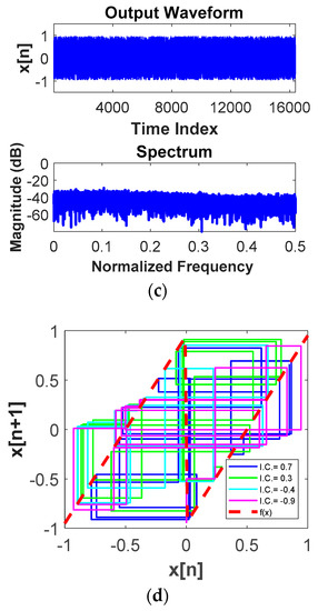 (a) Self-feedback chaotic system; (b) trajectory with piecewise-linear map; (c) output signal (upper figure) and spectrum (lower figure); (d) orbits with different initial states.
