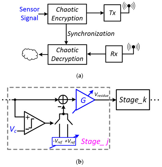 (a) Chaotic encryption for Tx and Rx; (b) open-loop residue amplifier; (c) multi-stage transformation function.
