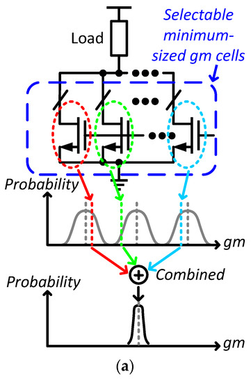 Although the CMOS technology reaches the deep-submicron regime, performance of digital circuits follows the prediction of Moore’s Law in the past decades. Performance of leading microprocessor doubles approximately every 18 months [1]. However, analog, mixed-signal circuits, and radio-frequency (RF) circuits are left far behind this trend. For example, performance of analog-to-digital converters (ADCs) takes 6.5 years to double [2]. Even the leading ADCs have a slightly faster progress rate of doubling every 4.7 years. Obviously, the RF and analog circuits are not able to take full advantage of process progress. Even the analog circuits cannot fully benefit from the technology scaling, analog circuits still play the quintessential role of interfacing digital signal processors to analog physical world in almost every electronic device, especially in the billions of Internet of things (IoT) devices. Challenges in the nano-meter scale would be even more rigid for RF/analog circuits since the power supply voltages decrease. Although threshold voltages in the advanced technology reduce as well, the available voltage headroom for these complicated mixed-signal functions still degrades rapidly. Besides, the problem of process variations is another challenge for robust design of RF/analog circuits due to aggressive technology scaling. In order to address matching issues in the nano-scale technology nodes, conventional sizing methods [3] that adopt large-size transistors for RF/analog circuits is still very popular even in advanced complementary metal–oxide–semiconductor (CMOS) processes. Although many of systematic variations can be predicted and tackled by utilizing careful circuit and layout techniques. The problems of large random variations are still needed to be addressed with alternate methods other than conventional up-sizing methods. The redundancy method [4] was proposed to address this issue and demonstrated in flash ADC designs. To achieve a better energy efficiency, statistical element selection (SES) [5,6] was proposed to exploit the combinations of random mismatches. In this paper, the combinatorial randomness will be utilized to efficiently the exploits subcomponents of the input differential pairs in the analog amplifiers to mitigate the impact of the process variations. A design example of a chaos-based true random number generator (TRNG) will be presented to demonstrate how the combinatorial randomness can be adopted to reduce the power consumption while the circuit is operating at ultra-low power supply voltage.