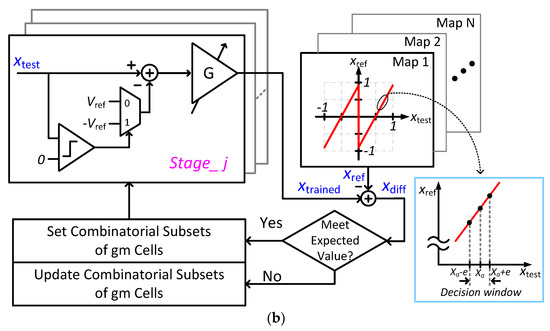In order to minimize power consumption, combinatorial randomness of intrinsic transconductance from minimum-sized devices will be deployed to provide maximum programmability, as shown in Figure 12a. Process variations result in a wide-range gm from the selectable devices, where the combinatorial gm can be characterized with decision windows to generate different gains for the transformation function. When signals propagate to the next stage, the first map will be reconfigured to ensure that the overall gain follows the dynamic law without interrupting its operation. Figure 12b shows the control loop to train the transformation function with different maps. The algorithm compares the Xref and Xtrained to update the selection of the combinatorial subset until the average of Xdiff is equal to zero. The transformation functions can be updated from time to time so that the signal can travel in time-varying orbits to enhance the strength of the security. Given that devices are with various intrinsic transconductances after fabrication, different subsets will be enabled for different devices. Hence, every device is unique so that it is inherently embedded with un-clonability. The reconfigurable chaotic system is expected to achieve sub-nW operations by exploring nonlinear dynamical effects and combinatorial intrinsic transconductance.