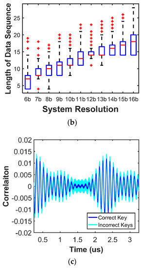 To assess the proposed reconfigurable chaotic system, we have created a compact simulation model of two-stage residue amplifiers based on physical characteristics and different noise levels. Each residue amplifier works at difference phase. As the simulation results shown in Figure 13a, the output signals appear to have the chaotic behavior with zero cross-correlation and impulse-like auto-correlation. To determine how often the chaotic systems need to be synchronized, the internal noise is set to different levels from 6-bit to 16-bit resolution, where the internal clock of the transformation function is 100 times of the input signal. Therefore, for each sampled data, the internal noise is integrated in the loop for one hundred cycles. Figure 13b shows that synchronization rate increases when the internal noise level is higher. For instance, with a 6-bit noise-level, the system needs to be synchronized every ten sampling periods, while with 16-bit resolution, the synchronization cycle extends to 20 sampling periods. The signal can be transformed effectively into deterministic noise without showing intelligible patterns on the power supply. Figure 13c illustrates unsuccessful CPA attacks on the proposed chaotic system with 50,000 traces. These simulation results demonstrate that this approach can counter side-channel attacks. With synchronization between two chaotic systems with combinatorial randomness, the decoded signal has been recovered with less than 1% performance degradation comparing to signals without being scrambled. This data confirms that the proposed approach for improving sensory-interface security with combinatorial randomness is feasible and effective.