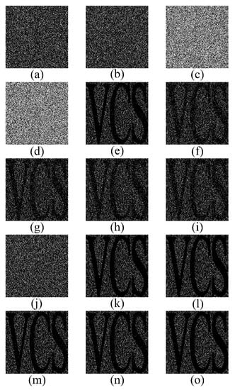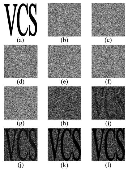 Figure 7 shows the experimental results. Figure 7a,b are two essential shadows and Figure 7c,d show two non-essential shadows, which have the same size of the secret image. Figure 7e–j illustrate the recovered image by stacking any two shadows. Since none of the essential shadows are included in {3, 4}, Figure 7j is as cluttered as random noise and does not show any information about the secret image. Figure 7k–n show the revealed image recovered by any three shadows and the last one is revealed by all shadows. Stacking two or more shadows that include any one or two essential shadows can reveal the secret image. Reconstruction without the essential shadow cannot get obtain information regarding the secret.