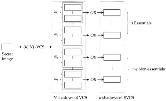 The idea for constructing (t, s, k, n)-EVCS is that we generate the shadows by a monotonic (K, N)-VCS. The secret image is first shared into N shadows by (K, N)-VCS. Subsequently, each essential (non-essential) shadow of EVCS is obtained by the superposition of () shadows of VCS. Obviously, we have