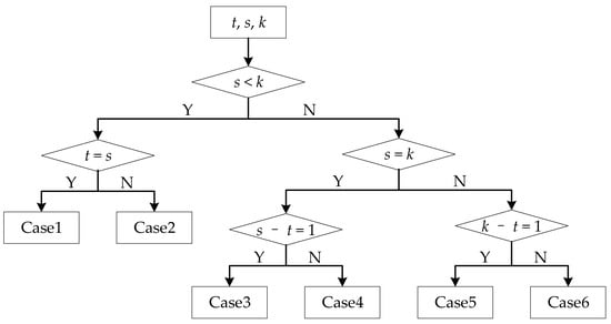 We need to solve IPM I or IPM II to determine the values of , , K and N. Before we solve IPM, we divide the relationship among t, s and k into six cases: (Case 1) , ; (Case 2) , ; (Case 3) , ; (Case 4) , ; (Case 5) , ; (Case 6) , . Figure 4 shows the diagram of the division for different cases. For Case 1 and Case 2, we need to solve IPM I. For the other cases, we need to solve IPM II.