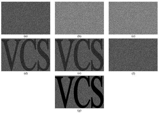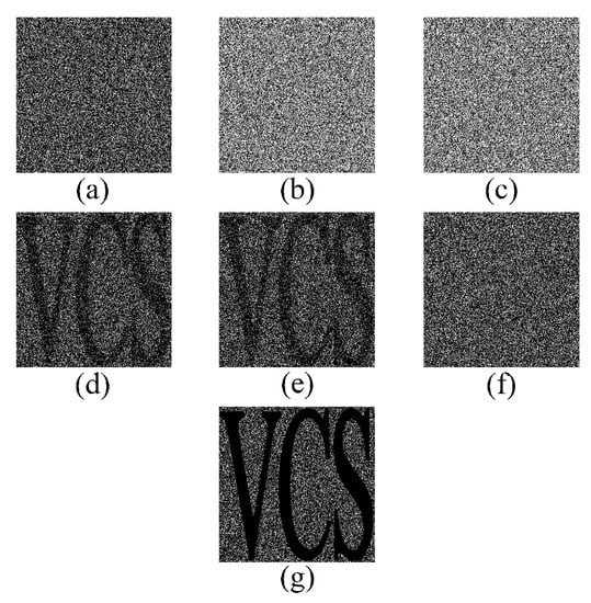 The experiment of the proposed (1, 2, 3)-EVCS. (a) essential shadow; (b,c) two non-essential shadows; (d) revealed image by shadow 1 and 2; (e) revealed image by shadow 1 and 3; (f) revealed image by shadow 2 and 3; (g) revealed image by all three shadows.