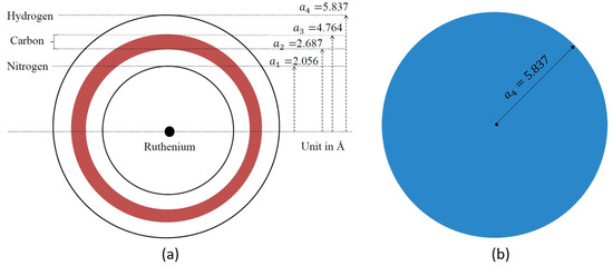 The molecular structure of Ru(bpy) is CHNRu is shown in Figure 1. The ruthenium (Ru), nitrogen (N), carbon (C), and hydrogen (H) atoms are all radially distributed from the centre, and therefore, as shown in Figure 2a, we may model the molecule as spherical layers of N, C, and H atoms and with the Ru atom located at the centre of the molecule. We observe that C atoms are densely packed between N and H layers. Consequently we assume that the layer of C atoms is modelled as a shell of a certain thickness ℓ.