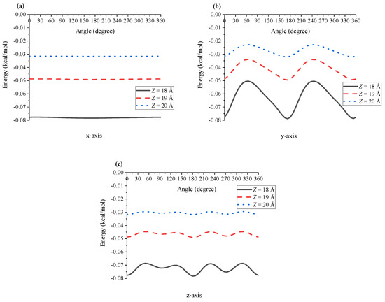 Interaction energy between two dye molecules when first molecule rotates about (a) x-, (b) y-, and (c) z-axis.