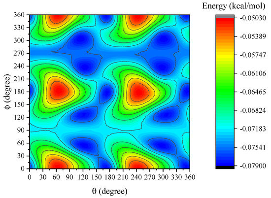 where represents the distance between atom and atom of two molecules. The values of the Lennard-Jones parameters used in MD simulations are assumed to be the same to those used in the continuum models, which are given in Table A1. Only the atoms at distances less than the cut-off radius Å are assumed to interact with each other.