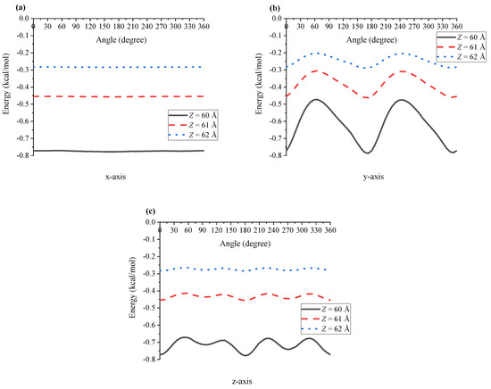Interaction energy between dye molecule and TiO when dye molecule rotates about (a) x-axis, (b) y-axis, and (c) z-axis.