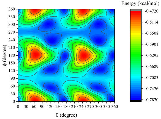 For the interaction between a dye molecule and a sphere of TiO, in the MD simulation, the dye molecule is rotated and moved toward the fixed TiO sphere, assuming that the radius of the TiO sphere is 50 Å (see Figure A2 in Appendix C). The energy profiles for the dye molecule, rotated in the three directions, interacting with TiO are depicted in Figure 5. We see that the energy exhibits fluctuations similar to those of the two dye molecules but with higher energy values. As shown in Figure 6 for Å, two configurations corresponding to and , and and give the highest energy of kcal/mol and the lowest energy of kcal/mol, respectively.