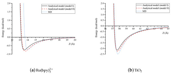 We note that the atoms in the continuum model are assumed to be smeared over the molecule which is different from MD where the discrete positions of each atom are required. These differences lead to the different values for the energy between the continuum models and the MD simulation. On the other hand, the continuum approximation for the atoms has only a minor impact on the energy of the dye molecule interacting with TiO because a semiconductor with the radius Å is much larger than the size of the dye molecule. Hence, the energy profiles of the continuum models are hardly different from the discrete model in the case of the dye-TiO interaction as illustrated in Figure 7b.