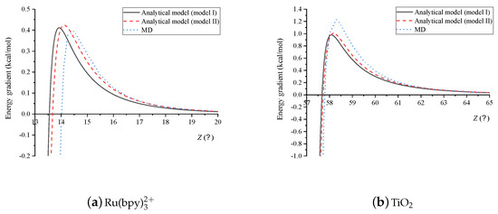 Energy gradient between (a) two dye molecules and (b) dye molecule interacting with TiO molecule obtained from continuum Models I and II, and from MD simulation.