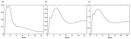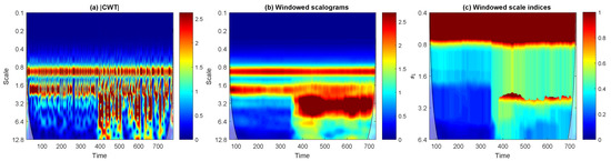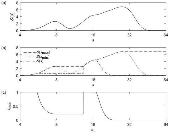 For example, Figure 1 plots the scalogram and the scale index of a given signal, taking and varying from 4 to 64. It can be seen that for approximately, but there are scales in at which the scalogram takes a greater value than at . So, as it is indicated above, if we want to make a wider scale study of non-periodicity, then should be increased in these cases. Nevertheless, if we are interested in measuring non-periodicity only in a determined scale interval with , then we can conclude that the signal is highly non-periodic in , and the reason in this case is that there are significant scales outside the range of study.
