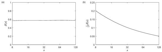 It is known that the wavelet power spectra and, consequently, the scalogram of a signal are biased in favor of large scales (see [22]). This feature has to be taken into account by some wavelet tools that quantify the “energy density” based on the scalogram, such as the wavelet squared coherency (see [21,23]) or the windowed scalogram difference (see [19]). In these tools, the scalogram is multiplied by the factor for normalizing the weight of each scale (see Figure 2), or, from another point of view, the mother and daughter wavelets are normalized using the -norm instead of the -norm. However, in the case of the scale index, this correction would not be necessary because the scalogram of a white noise signal is more or less constant at all scales giving a scale index close to 1 for any , and this is the property that we want to preserve. If, on the other hand, we apply the correction for converting the scalogram into an “energy density” measure, the scale index of a white noise signal would tend to zero as we increase (see Figure 3) and this is not desirable.