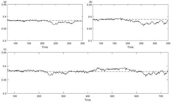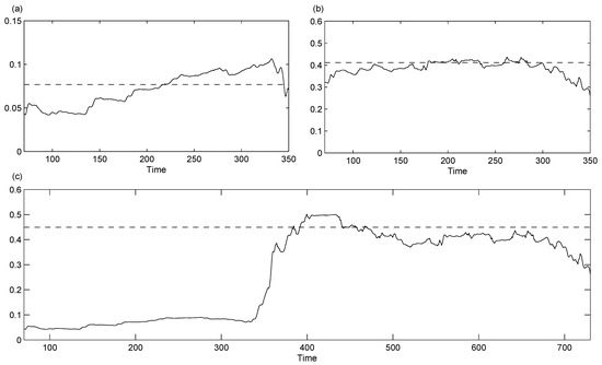 Sample entropies of series 1, 2 and 3 (see (a), (b) and (c) respectively) considering subseries centered at different times with time radius . The corresponding global SampEn is represented with a dashed line.