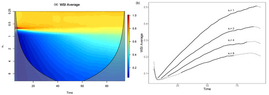 Average of the windowed scale indices of 1000 series of the form (13) taking and different values for , using Morlet wavelets and time radius . The cone of influence outside which there are border effects is represented with a black line (a) and dots (b).