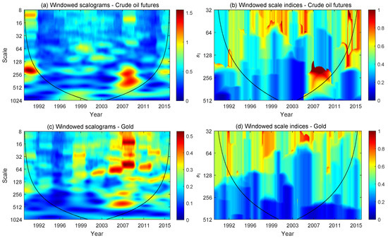 Figure 8 displays the windowed scalograms and windowed scale indices of changes in the price of crude oil and gold futures contracts. The windowed scalograms use a time radius days and the windowed scale indices are calculated from these windowed scalograms taking days and a wide range of scales , from 32 to 512 days. We have not used inner scalograms in this case. Therefore, the corresponding cones of influence outside which there are border effects have been plotted.
