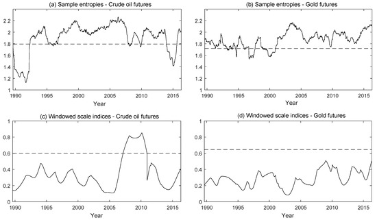 Likewise, the sample entropies are estimated for the crude oil and gold futures contracts in Figure 10, plots (a) and (b), using a rolling window of radius days. The global SampEn for the oil futures contracts series yields overall higher values than for the gold futures contracts (dashed lines), but the differences are again very small. On the other hand, the sample entropies estimated on a rolling window (solid line) take, for certain time intervals, larger values for the crude oil futures than for the gold futures contracts, and vice versa. In order to compare with the windowed scale index, in Figure 10, plots (c) and (d), we also show the sections at days (a scale representative of the medium term) of the windowed scale indices plots of Figure 8, in which a time radius of days was also employed. Moreover, the corresponding global scale index is represented by a dashed line. It can be seen that the windowed scale indices of crude oil futures contracts increase considerably during the global financial crisis, unlike what happens with the gold futures contracts. Besides, the global scale index of the gold futures contracts is slightly greater than the global scale index of the crude oil futures contracts, showing that in this case, the windowed scale index provides more reliable and detailed information than the global scale index.