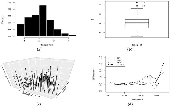 A descriptive summary of the response variable includes the sample values (in cmolc/dm3) of the median = 2.0306; mean = 2.008; standard deviation = 0.7713; coefficient of variation = 0.3841; coefficient of skewness = 0.3394; coefficient of kurtosis = 2.9717; minimum = 0.5734; and, maximum = 4.2538. Figure 3 shows the histogram (a), boxplot (b), and scatterplot (c) of the values of the response T. In the boxplot, we detect two outliers that correspond to locations #12 and #47. The directional variogram in Figure 3d shows that there is no preferred direction, that is, an omni-directional semi-variogram is appropriate. Thus, the associated stochastic process can be considered as isotropic.