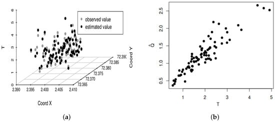 Figure 4 provides the QQ plot of the residuals, transformed by the Wilson–Hilferty approximation, after removing a location that was outside the bands. Note that most of the residuals are inside of the bands. Additionally, Figure 5a displays a three-dimensional scatterplot that shows the estimated and observed values of T. These same values are presented in a two-dimensional scatterplot in Figure 5b. These plots allow us to observe a good fit of our model to the data. Therefore, we conclude that the BS spatial quantile regression model is adequate to describe these spatial data, but a better fitting could be obtained if a heavy-tailed asymmetric distribution is considered, such as the BS-Student-t distribution. However, this is beyond of the objective of the present study and it provides a challenge for further research.