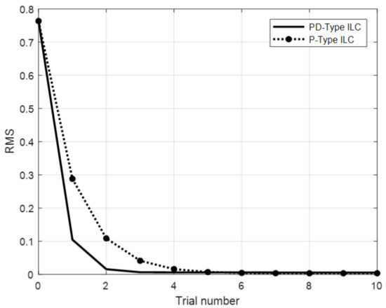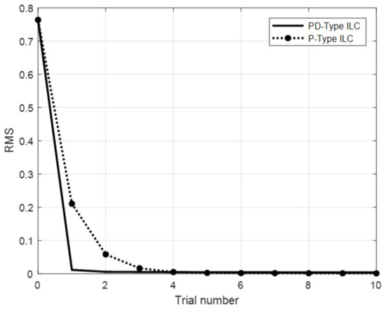 In Figure 3, the curve of the RMS error of the system with the number of iterations under the action of the two control laws is given. All of these show that the tracking errors of norm-bounded uncertainty systems converge monotonically under the action of two control laws, and the system has better convergence performance under the action of state feedback PD type iterative learning control.