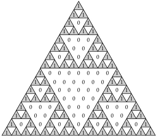 In the sequel, the sequence will be simply denoted by . Table 2 shows the first eight binomial coefficients as well as the first eight binomial sequences with their corresponding periods and linear complexities. To check the form of the first 32 binomial sequences, see reference [38]. Moreover, recall that binomial sequences are just shifted versions of the successive diagonals of the Sierpinski’s triangle depicted in Figure 2.