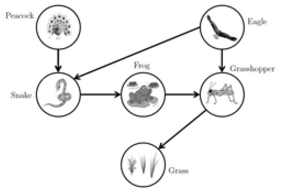 Cohen [1] first developed the concept of competition graph (CG) to solve the problem of the food web in ecology. The problem of a food web is to describe the predator-prey relationship among species in the community. Food web is a relationship network framed to describe the relationships among food habits of species. It is a fact that there is a predator-prey relation in ecosystem among the species. The plants are the main source of energy for all the living entity. Species are classified into few levels depending on the predator-prey relationship; for example, primary producer (plants), primary consumer (herbivorous), secondary consumer (carnivorous) and omnivorous. In ecosphere, the plants those are the primary producers can produce through photosynthesis. Herbivorous eats only plants for energy, carnivorous takes herbivorous as their food. There is no unique choice of food to omnivorous. From primary producers to secondary consumers there is a food chain among themselves. But the food web is not same at all as a food chain. An example of a food web is shown in Figure 1. In this figure, grasses are the main source of food and grasshoppers eat them, frogs eat grasshoppers, snakes eat frogs, peacocks have snakes but, eagle depends on snakes as well as grasshoppers. If some species say grasshopper, abolished in this food web, other species (here, eagle) who depend on the abolished species may either exterminate or may have to make every effort for existence adapting another food habit depending on ecological nook, habitat and surrounding atmosphere. Same species may have different food habits in different places depending on ecosystem, habitat and surrounding atmosphere. In this example, shown in Figure 1, it is considered that in a certain ecosystem, 70–80% eagle depends on the grasshopper and 30–40% on snake for his food need. These can be transferred to its similar correspondence to interval-valued fuzzy number as [0.7, 0.8] and [0.3, 0.4] respectively. Peacock has 100% dependence on snake, the snake has 100% dependence on frog and frog has that on a grasshopper. Grasshopper depends only on grass. If any two species depends on the same species, there must be a competition between those two species. Being motivated by this idea, we can model up this natural phenomenon as an IVFCG. In addition to ecology, this graph model has many uses in circuit designing, economical model and coding as well as energy systems, etc.
