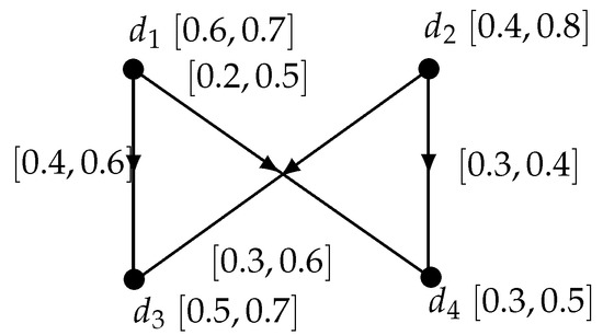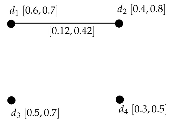 - The membership values of vertices that are taken as companies is a sub-interval of . The significance of this interval number is that every company has a minimum and maximum capability to produce the product. We have assigned a grade to each power of capabilities within the min-max range. So, the interval becomes a fuzzy interval number.